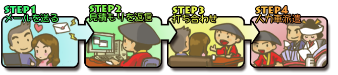 メールには、住所、お名前、人力車の派遣先、派遣日、派遣内容、メールアドレス等を明記してください。