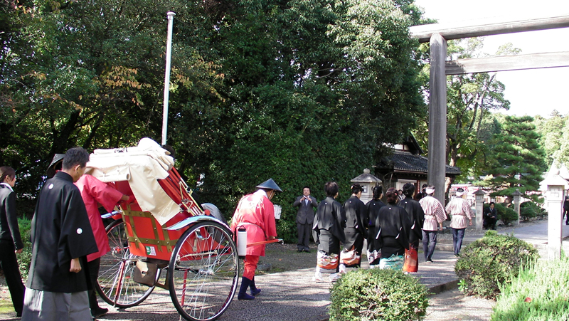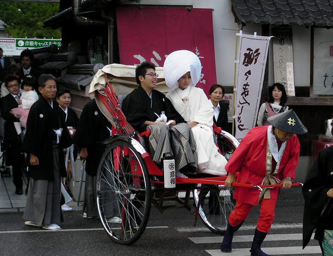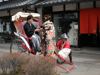 結婚式の前撮り撮影、新郎新婦の移動手段として座席の高い人力車は注目度があり